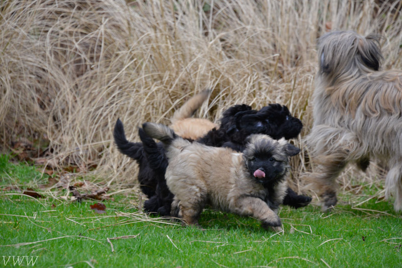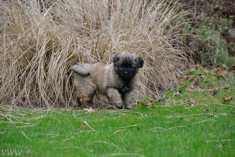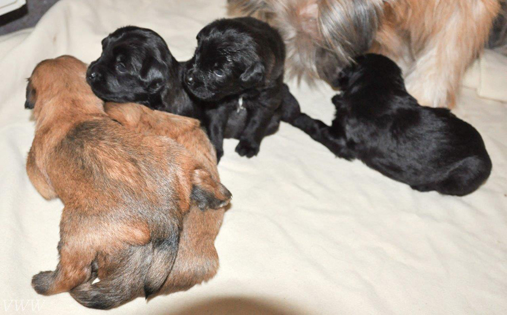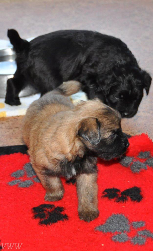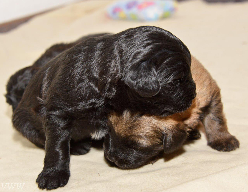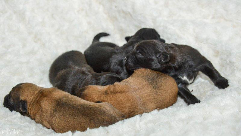 Es sind 3 Hündinnen (2 schwarze und 1 fauve) und 2 Rüden (1 schwarzer und 1 fauver). Die Geburtsgewichte lagen zwischen 270g und 320 g. Vater der Welpen ist Ginster vom Wissener Wald. Die Rüden erhielten die Namen Juglandis und Juniperus. Die Hündinnen heißen Jasmin, Jonquille und Jupiterblume. Akelei kümmert sich rührend um die Minis. Für uns ist es das erste Mal, dass wir zwei Würfe gleichzeitig aufziehen - wir freuen uns auf dieses Aufgabe.