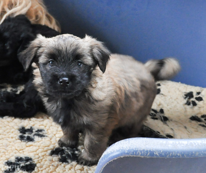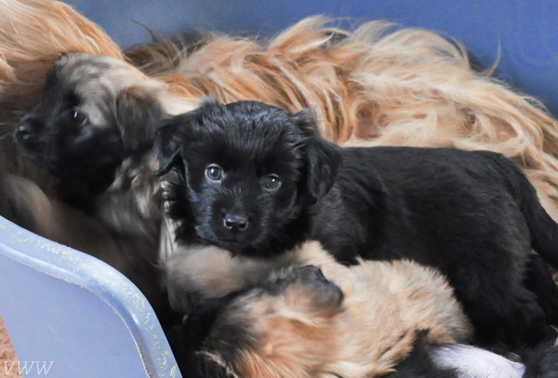 Unsere fünf Minis haben erfolgreich an dem Anstieg ihrer Gewichtskurve gearbeitet. Seit der 2. Lebenswoche haben sie ihre Augen geöffnet. Langsam nehmen sie die Gestalt kleiner Hunde an, auf ihren vier Pfoten sind sie schon sehr flink und geschickt unterwegs, die Geschwister werden zum Spielen entdeckt und das erste zaghafte „Wau“ wurde auch schon von sich gegeben, der erstaunte Gesichtsausdruck – oh, war ich das- ist leider mit Worten nicht zu beschreiben. Unsere Akelei ist eine tolle Hundemama, beide „Mädels“ machen einen tollen Job.