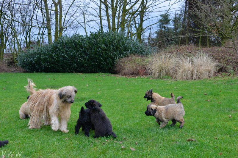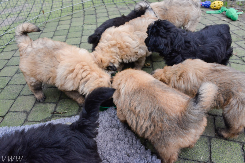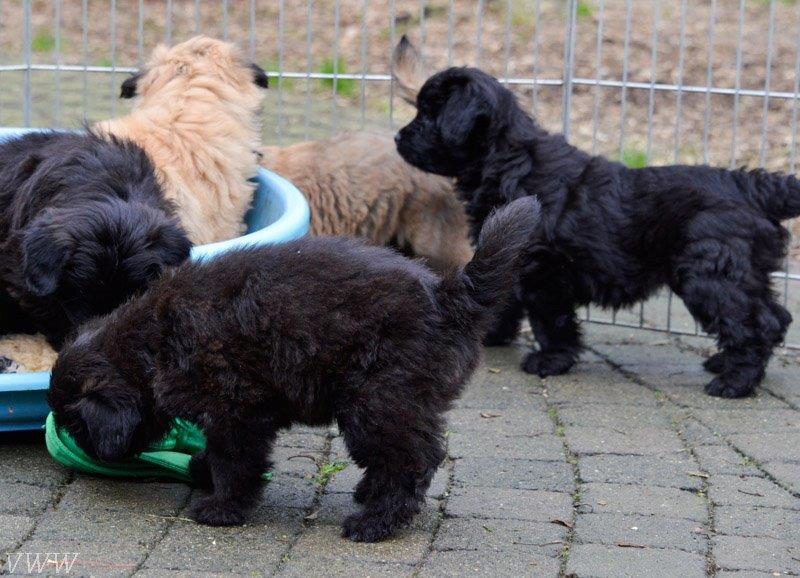 Unsere 5 Wuseln sind rege unterwegs. Mit den 3 kleinen Verwandten vertragen sie sich super. Der Welpenbrei wird gern genommen und Mama Akelei erfährt so ein wenig Entlastung. Nun werden die ersten Besucher erwartet.