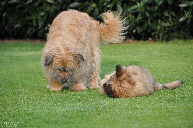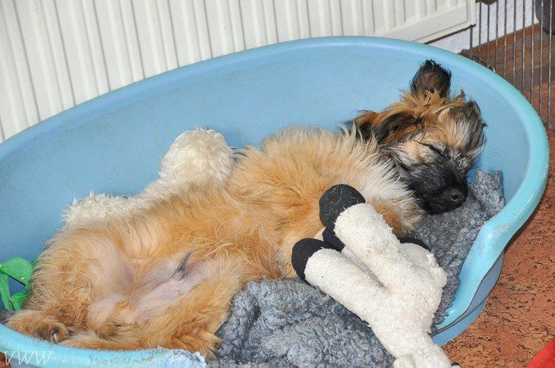 Unser Löwenzahn ist nun schon 5 Wochen alt, inzwischen gibt es neben Mamas Milch auch leckeren Welpenbrei. Auch wenn der Größenunterschied zu den "K's" schon recht groß ist klappt das mit dem gemeinsam Spiele ganz gut. Ebby geht in ihrer Mutterrolle auf, was uns sehr freut.
